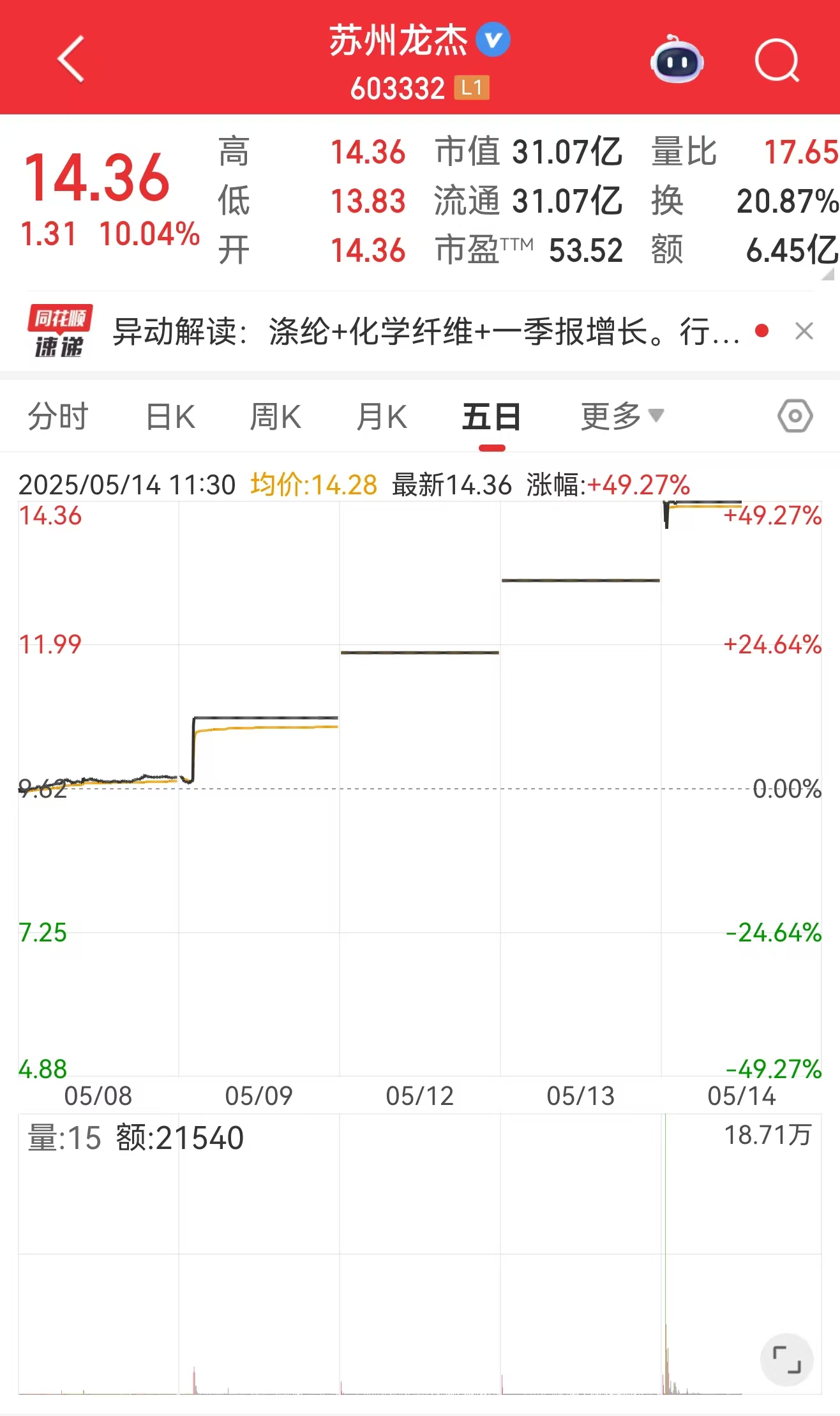 “在當前市場(chǎng)環(huán)境下,資金對具備業(yè)績(jì)支撐且處于熱點(diǎn)板塊的個(gè)股青睞有加。蘇州龍杰4天4板的走勢,吸引了大量的市場(chǎng)目光,形成了一定的賺錢(qián)效應,進(jìn)一步刺激了投資者的參與熱情。游資和機構資金的積極介入,為股價(jià)的持續上漲提供了強大的資金動(dòng)力!北姾屠觯ū本┵Y產(chǎn)管理有限公司董事長(cháng)柏文喜認為,不過(guò),盡管化學(xué)纖維板塊目前表現強勢,蘇州龍杰股價(jià)一路走高,但投資者仍需保持理性。一方面,化學(xué)纖維行業(yè)受原材料價(jià)格波動(dòng)、國際貿易摩擦等因素影響較大,未來(lái)業(yè)績(jì)存在一定的不確定性;另一方面,蘇州龍杰當前股價(jià)漲幅較大,估值水平相對較高,后續股價(jià)走勢還需關(guān)注公司業(yè)績(jì)的持續增長(cháng)能力以及市場(chǎng)資金的流向變化。