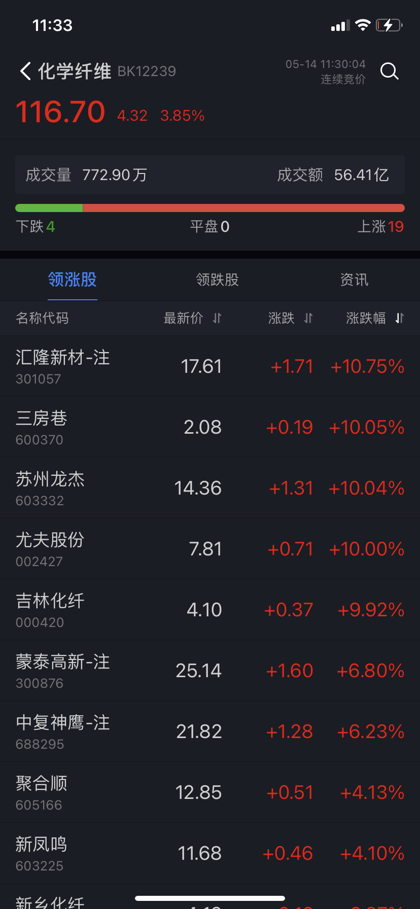 5月14日,A股市場(chǎng)三大指數漲跌不一。截至中午收盤(pán),上證指數報3381.17點(diǎn),微漲0.19%;深證成指報10261.62點(diǎn),下跌0.26%;創(chuàng )業(yè)板指報2057.72點(diǎn),下跌0.22%。板塊方面,化學(xué)纖維板塊表現亮眼。截至午間收盤(pán),銀河證券化學(xué)纖維板塊指數報116.7點(diǎn),單日漲幅達3.85%,成交額56.41億元。板塊內19只個(gè)股上漲、4只下跌,呈現顯著(zhù)普漲格局。