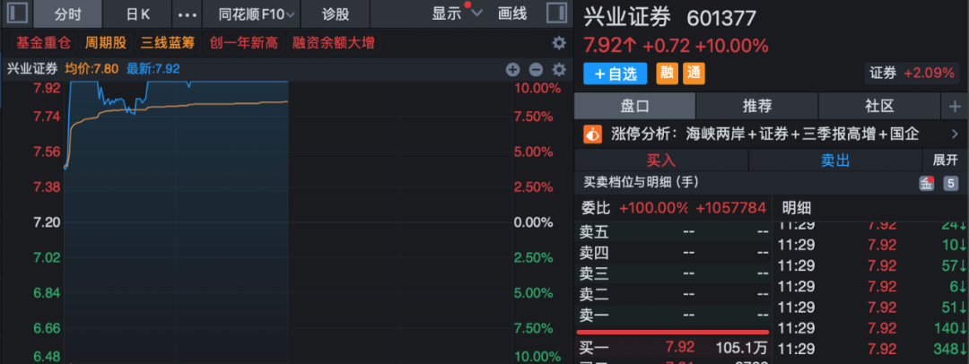 券商股早間大幅高開(kāi)高走,板塊指數盤(pán)中一度漲逾3%,半日成交超前一交易日全天成交。板塊內所有個(gè)股飄紅,興業(yè)證券開(kāi)盤(pán)后僅約3分鐘垂直漲停,股價(jià)創(chuàng )近4年來(lái)新高(復權);東北證券、華泰證券、華安證券(600909)、國泰海通等漲幅居前。