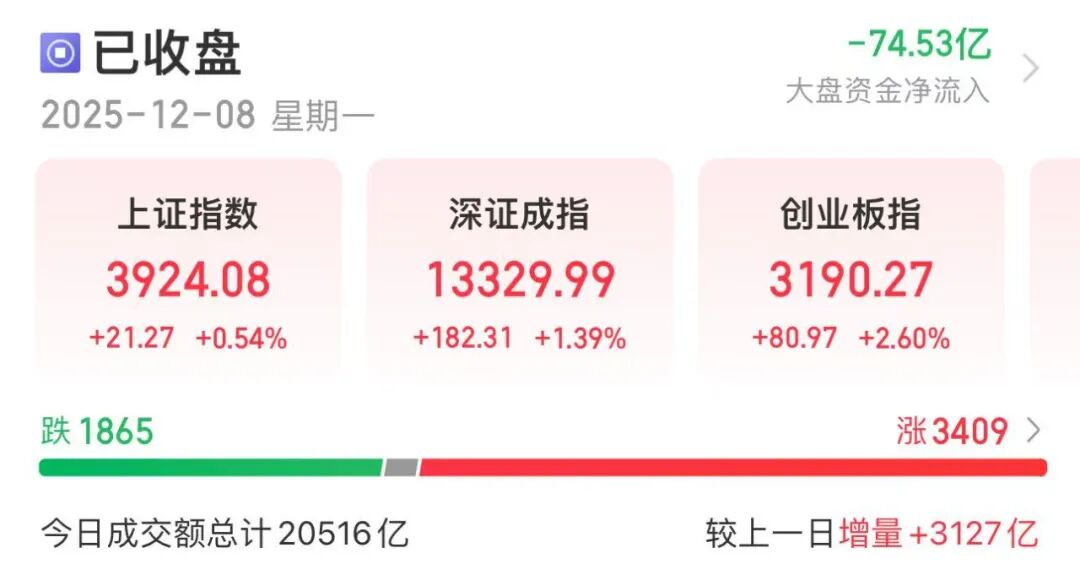 今日,A股市場(chǎng)成交額時(shí)隔16個(gè)交易日,再度突破2萬(wàn)億元。截至收盤(pán),上證指數漲0.54%,深證成指漲1.39%,創(chuàng )業(yè)板指漲2.6%。