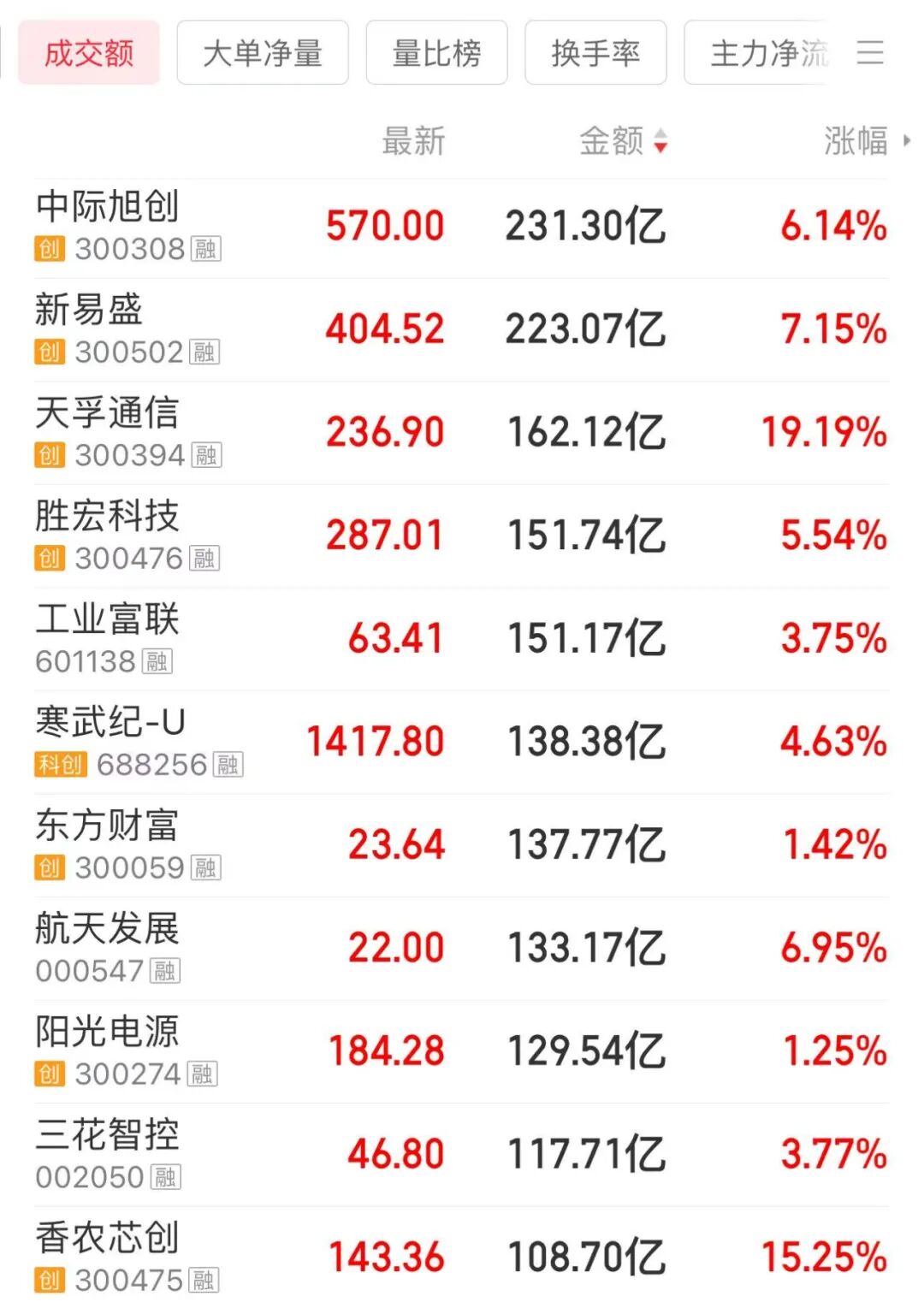 科技主線(xiàn)活躍,共封裝光學(xué)(CPO)板塊全天領(lǐng)漲,CPO概念三大龍頭“易中天”(中際旭創(chuàng )(300308)、新易盛(300502)、天孚通信(300394))成交額均超160億元,位列全市場(chǎng)成交額前三。天孚通信盤(pán)中“20CM”漲停,股價(jià)創(chuàng )歷史新高,收盤(pán)漲19.19%,最新市值為1841.7億元。此外,寒武紀午后一度大漲超6%,截至收盤(pán)漲4.63%。