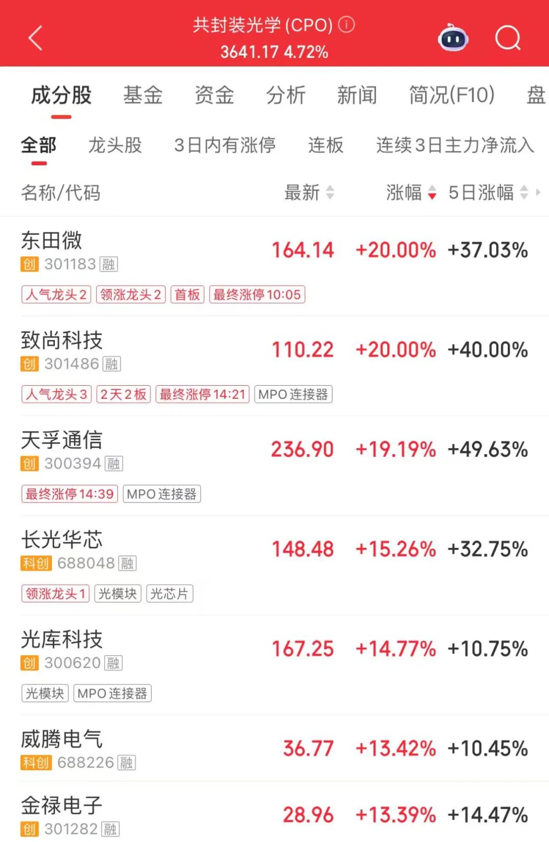 今日,大科技主線(xiàn)活躍,算力產(chǎn)業(yè)鏈持續走強。共封裝光學(xué)(CPO)、F5G概念、光纖概念、銅纜高速連接、存儲芯片等板塊漲幅居前。東田微(301183)、致尚科技(301486)“20CM”漲停,天孚通信、長(cháng)光華芯等個(gè)股漲幅居前。