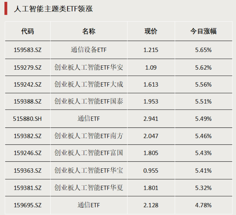 12月8日,A股市場(chǎng)強勢上漲。在個(gè)股普漲的同時(shí),多只人工智能主題類(lèi)ETF表現強勢,領(lǐng)漲ETF市場(chǎng)。