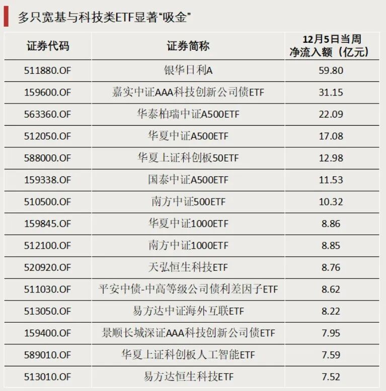 上周(12月1日—12月5日),寬基與科技類(lèi)ETF顯著(zhù)吸金,多只相關(guān)主題ETF單周凈流入額超10億元。