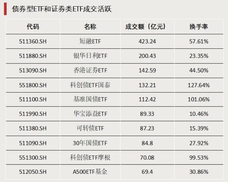 今日,多只債券型ETF和證券類(lèi)ETF交投活躍,短融ETF、銀華日利ETF、香港證券ETF、科創(chuàng )債ETF國泰、基準國債ETF等品種今日成交額超100億元。