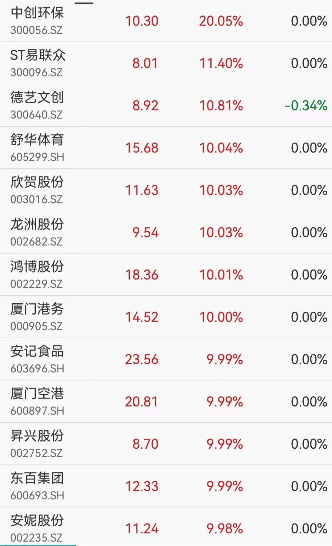 福建板塊延續強勢,多股漲停,安記食品(603696)6連板,舒華體育(605299)4連板,東百集團(600693)、廈門(mén)港務(wù)(000905)雙雙3連板。