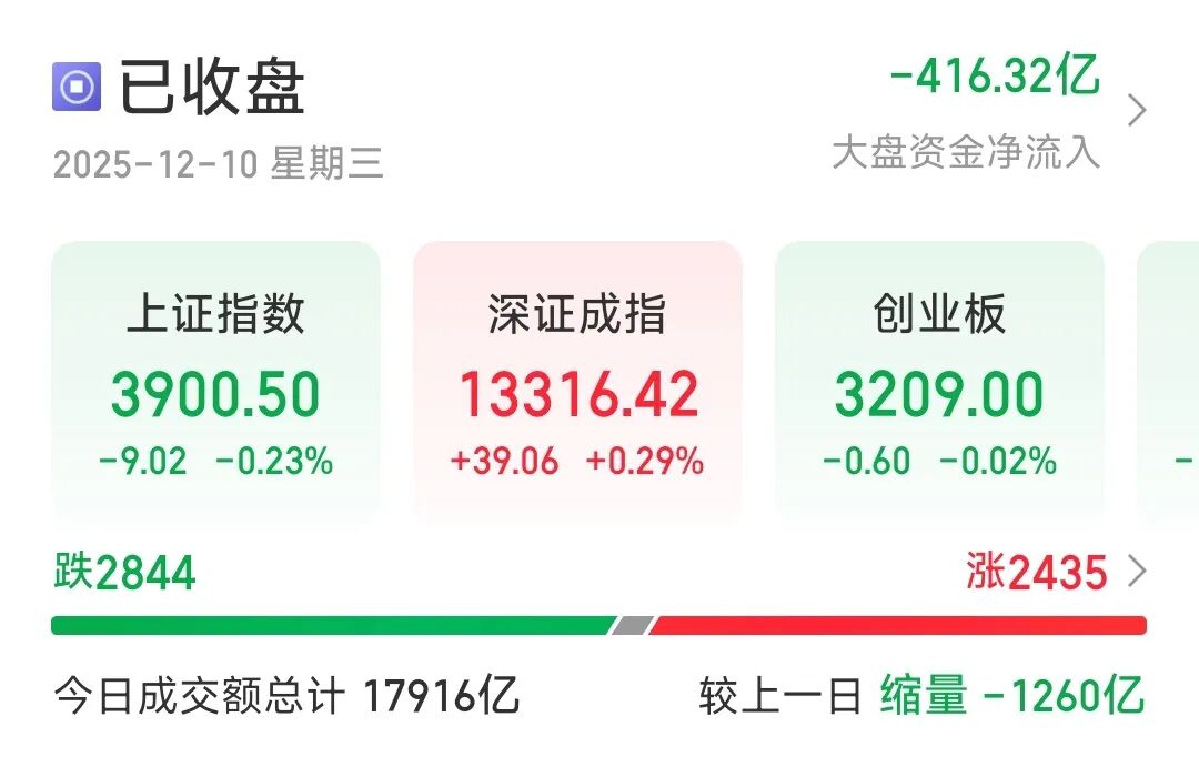 三大指數漲跌不一。截至收盤(pán),上證指數跌0.23%,深證成指漲0.29%,創(chuàng )業(yè)板指微跌0.02%,北證50跌0.85%。全市場(chǎng)成交額為1.79萬(wàn)億元,較上一日縮量1260億元。滬深兩市超2400只個(gè)股股價(jià)上漲。