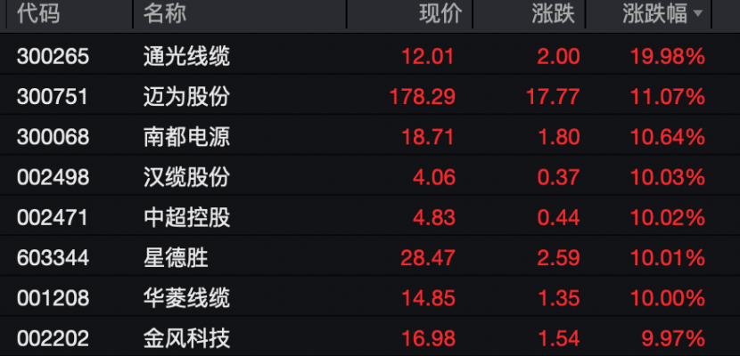 從行業(yè)和賽道來(lái)看,若按照申萬(wàn)一級行業(yè)劃分,電力設備板塊領(lǐng)漲,板塊內個(gè)股掀起漲停潮。通光線(xiàn)纜(300265)盤(pán)中“20cm”漲停,邁為股份(300751)、南都電源(300068)等盤(pán)中漲幅超過(guò)10%,漢纜股份(002498)、中超控股(002471)、星德勝(603344)、華菱線(xiàn)纜(001208)等多股盤(pán)中漲停。