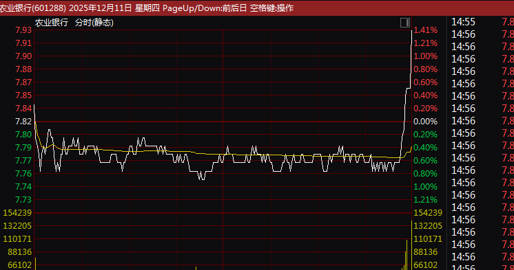 銀行股在收盤(pán)集合競價(jià)階段出現異動(dòng)走勢,板塊指數放量直線(xiàn)拉升翻紅。農業(yè)銀行臨近收盤(pán)垂直拉升由綠轉紅,中國銀行、工商銀行、交通銀行、郵儲銀行(601658)等尾盤(pán)就出現放量搶籌現象,并均以全天最高價(jià)報收。