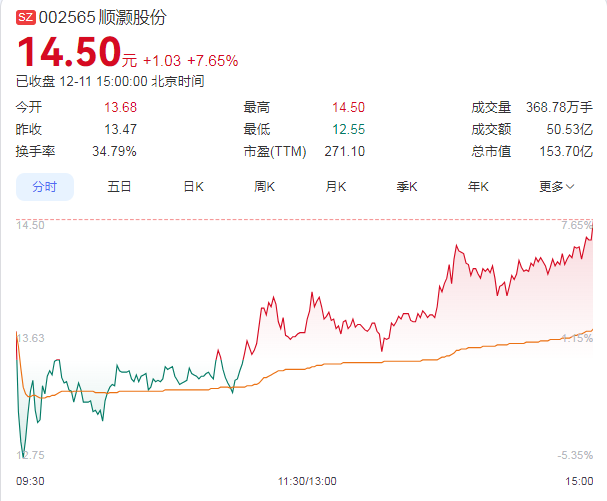 12月11日,順灝股份(002565)逆勢大漲7.65%,收盤(pán)價(jià)14.50元,成交額為50.53億元,總市值攀升至153.70億元。據統計,自11月24日以來(lái)的短短14個(gè)交易日內,順灝股份股價(jià)累計漲幅已超過(guò)109%,表現極為搶眼。