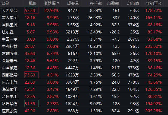 核聚變概念股走強,雪人集團(002639)、國機重裝(601399)、法爾勝(000890)、中國一重(601106)均直線(xiàn)拉漲停。