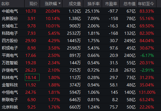 虛擬電廠(chǎng)板塊震蕩拉升,中能電氣(300062)20%漲停,兆新股份(002256)、長(cháng)城電工(600192)紛紛漲停。