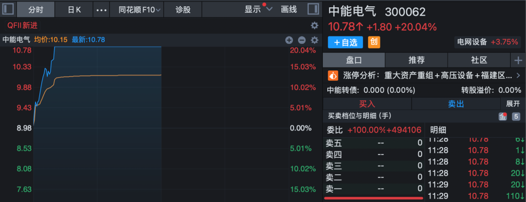 電力股早間集體上攻,電網(wǎng)設備方向領(lǐng)漲,板塊指數盤(pán)中放量大漲逾2%。中能電氣(300062)(300062)快速20%漲停,長(cháng)城電工(600192)、華菱線(xiàn)纜(001208)等多股一字漲停,中超控股(002471)秒速封板,風(fēng)范股份(601700)約3分鐘垂直漲停。