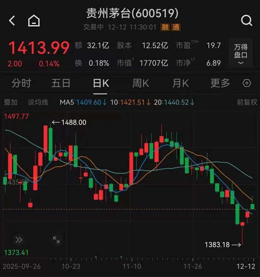 截至周五午間收盤(pán),貴州茅臺每股報1413.99元,最新市值約1.77萬(wàn)億元。