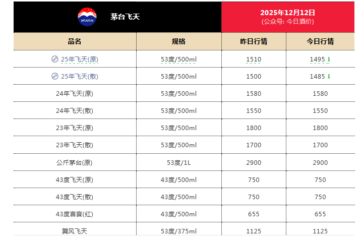 12月12日,“今日酒價(jià)”平臺披露各大名酒批發(fā)參考價(jià)顯示,2025年款53度500ml飛天茅臺原箱較前一日下跌15元,報1495元/瓶;散瓶較前一日下跌15元,報1485元/瓶。