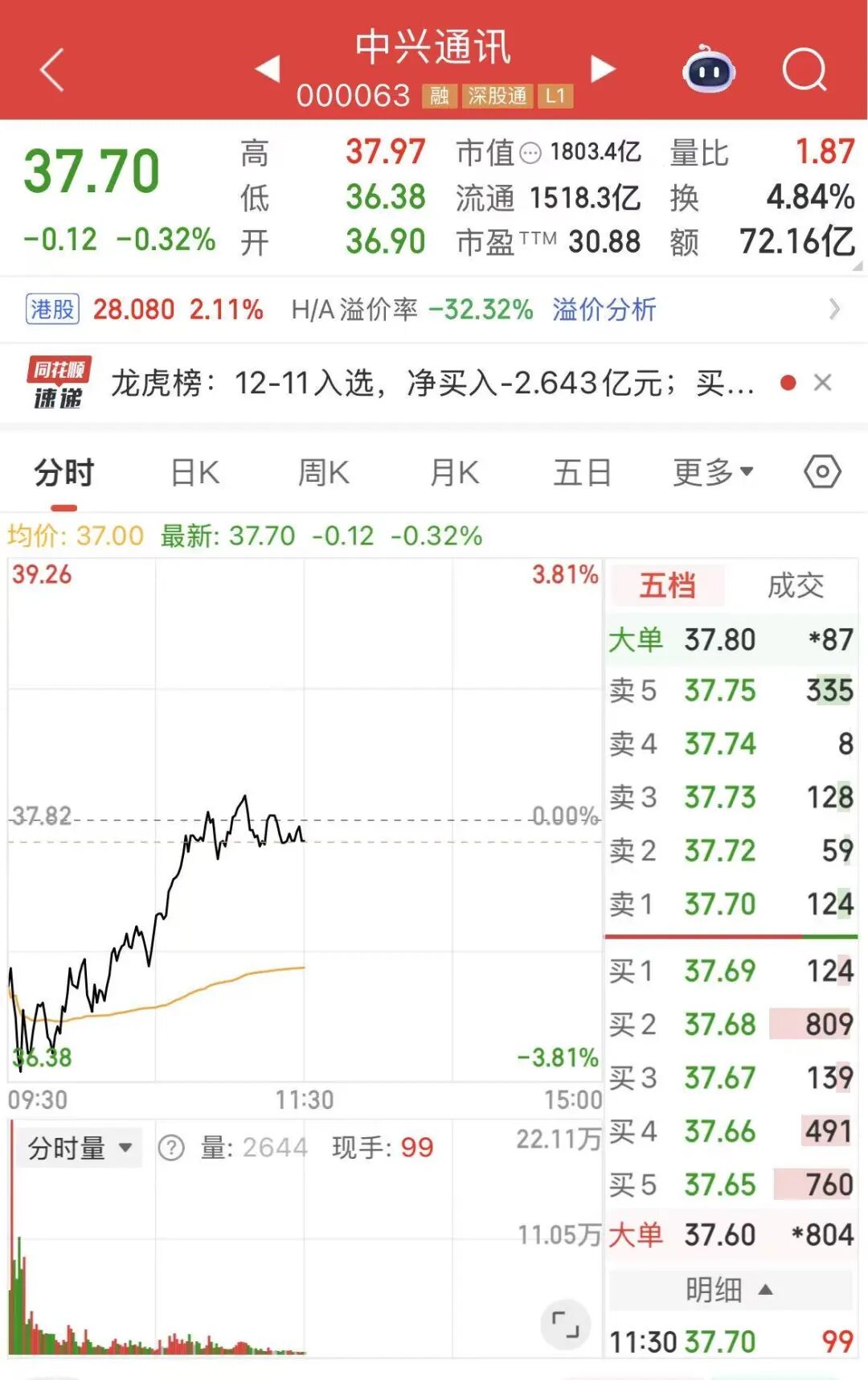 今日午間,中興通訊發(fā)布公告稱(chēng),公司擬使用自有資金以集中競價(jià)交易方式回購公司A股股份,用于實(shí)施公司員工持股計劃或者股權激勵。本次回購資金總額為不低于10億元且不超過(guò)12億元(均包含本數)。截至午間收盤(pán),中興通訊跌0.32%,報37.70元/股,總市值超1800億元。12月11日,中興通訊AH股遭遇重挫。(詳見(jiàn)本報此前報道《早盤(pán)大跌!中興通訊,緊急公告》)
