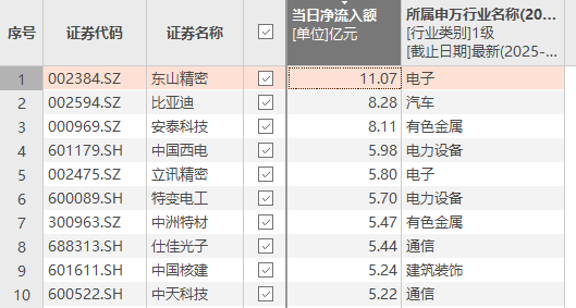 上證報中國證券網(wǎng)訊(記者 汪友若)數據顯示,12月12日,資金凈流入額排名前十的個(gè)股依次是東山精密(002384)、比亞迪(002594)、安泰科技(000969)、中國西電(601179)、立訊精密(002475)、特變電工(600089)、中洲特材(300963)、仕佳光子、中國核建(601611)、中天科技(600522)。其中,東山精密當日資金凈流入額為11.07億元。
