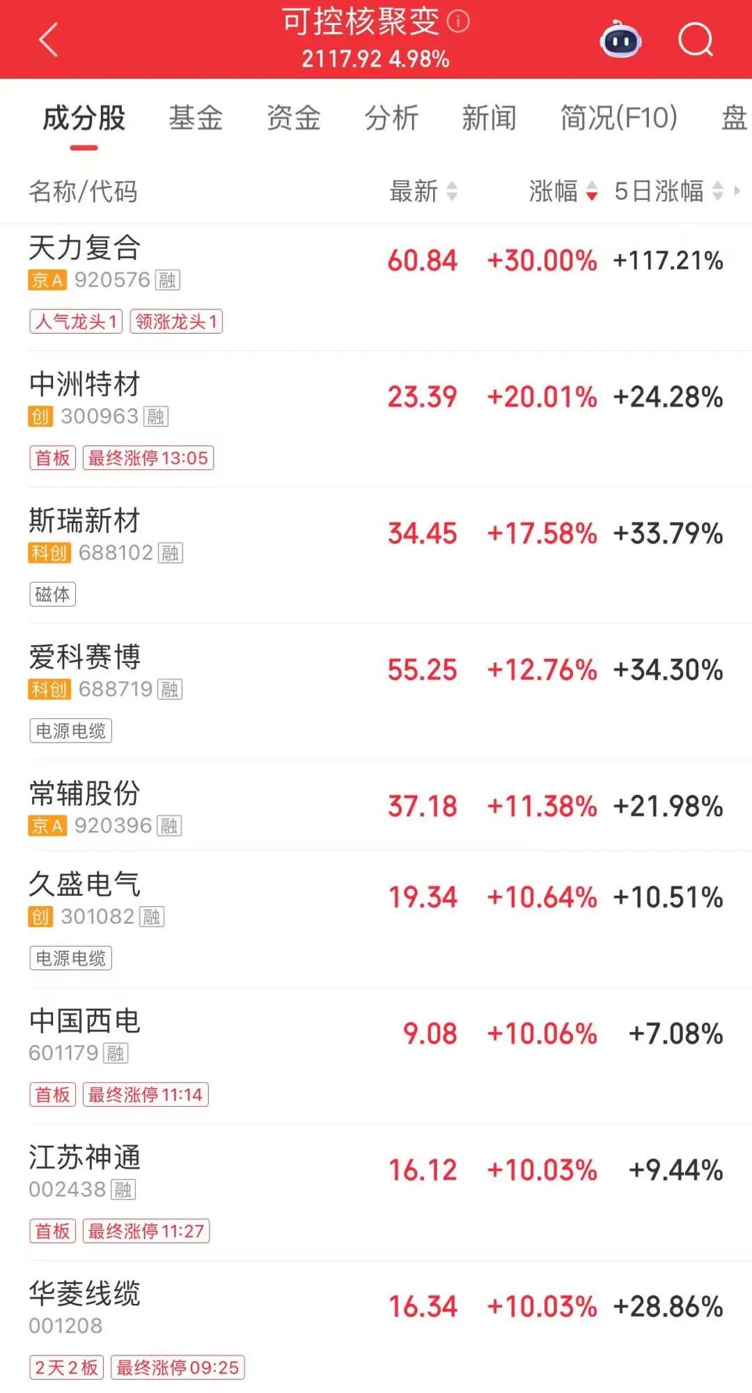 盤(pán)面上,可控核聚變板塊領(lǐng)漲,天力復合再度“30CM”漲停,走出2連板,股價(jià)創(chuàng )歷史新高,收盤(pán)報60.84元/股,5個(gè)交易日漲幅達117.21%。電網(wǎng)設備、超導概念、金屬新材料等板塊全天活躍。