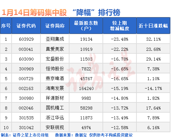除了ST股外,股東戶數(shù)降幅最多的是亞翔集成,截至1月10日最新股東戶數(shù)為19134戶,較12月31日下降30.46%;其次是真愛(ài)美家,截至1月10日最新股東戶數(shù)為10919戶,較12月31日下降22.22%。