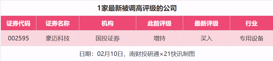 評(píng)級(jí)調(diào)高方面,2月10日,券商調(diào)高上市公司評(píng)級(jí)達(dá)到1家次,最新數(shù)據(jù)包括了國(guó)投證券對(duì)豪邁科技(002595)的評(píng)級(jí)從“增持”調(diào)高至“買(mǎi)入”。