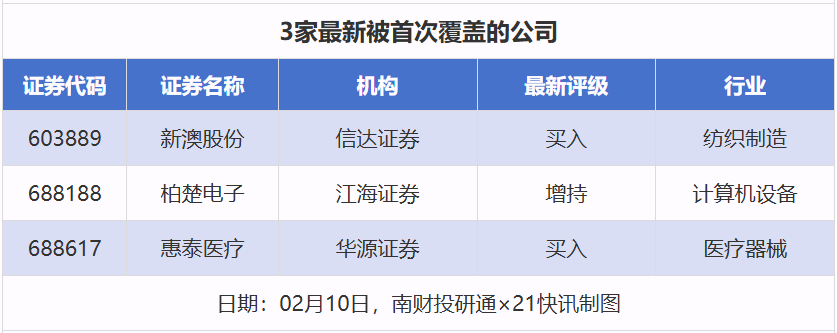 首次覆蓋方面,2月10日券商共給出了3次首次覆蓋,其中新澳股份(603889)獲得信達(dá)證券(601059)給予“買(mǎi)入”評(píng)級(jí),柏楚電子獲得江海證券給予“增持”評(píng)級(jí),惠泰醫(yī)療獲得華源證券給予“買(mǎi)入”評(píng)級(jí)。