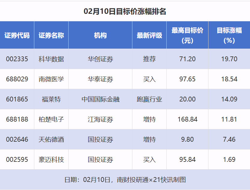 南財(cái)投研通數(shù)據(jù)顯示,2月10日,券商給予上市公司目標(biāo)價(jià)共6次,按最新收盤(pán)價(jià)計(jì)算,目標(biāo)價(jià)漲幅排名居前的公司有科華數(shù)據(jù)(002335)、南微醫(yī)學(xué)、福萊特(601865),目標(biāo)價(jià)漲幅分別為19.70%、18.54%、14.09%,分別屬于其他電源設(shè)備、醫(yī)療器械、光伏設(shè)備行業(yè)。