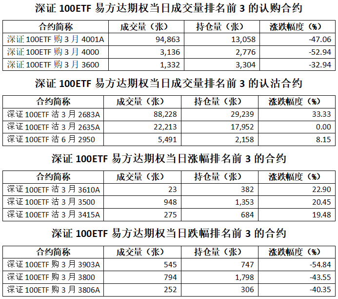 深證100ETF易方達(dá)期權(quán)總成交面額76.82億元,增加255.03%,期現(xiàn)成交比為0.03,權(quán)利金成交額0.08億元;期權(quán)總成交量227,540張,增加247.64%,其中認(rèn)購期權(quán)成交量105,697張,認(rèn)沽期權(quán)成交量121,843張,認(rèn)沽認(rèn)購成交比率為1.15(上一交易日認(rèn)沽認(rèn)購成交比率為1.61)。