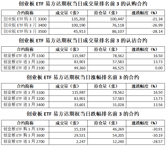 創(chuàng)業(yè)板ETF易方達(dá)期權(quán)總成交面額315.85億元,增加0.98%,期現(xiàn)成交比為0.13,權(quán)利金成交額5.12億元;期權(quán)總成交量1,015,608張,減少0.17%,其中認(rèn)購期權(quán)成交量435,106張,認(rèn)沽期權(quán)成交量580,502張,認(rèn)沽認(rèn)購成交比率為1.33(上一交易日認(rèn)沽認(rèn)購成交比率為1.51)。