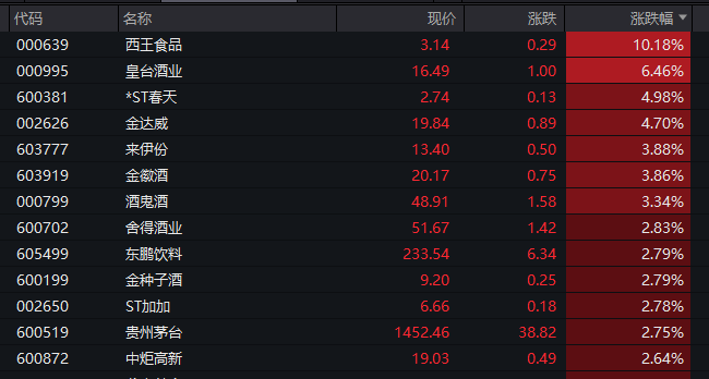 食品飲料板塊上行,板塊盤(pán)中漲幅超過(guò)2%。西王食品(000639)漲停,皇臺(tái)酒業(yè)(000995)大漲超過(guò)6%,另有多只酒類股跟漲。貴州茅臺(tái)(600519)放量上行,盤(pán)中漲幅一度超過(guò)3%。