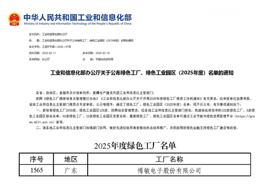 近日,國家工業(yè)和信息化部正式發(fā)布《工業(yè)和信息化部辦公廳關(guān)于公布綠色工廠、綠色工業(yè)園區(qū)(2025年度)名單的通知》,我司憑借在綠色、低碳、可持續(xù)發(fā)展領(lǐng)域的突出成效,經(jīng)省級工業(yè)和信息化主管部門推薦、專家評審、公示等嚴格程序,成功獲評國家級綠色工廠。