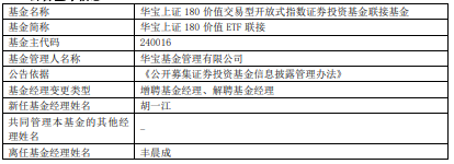 中國經(jīng)濟網(wǎng)北京4月17日訊今日,華寶基金公告,華寶上證180價值ETF聯(lián)接(240016)增聘胡一江,豐晨成離任。