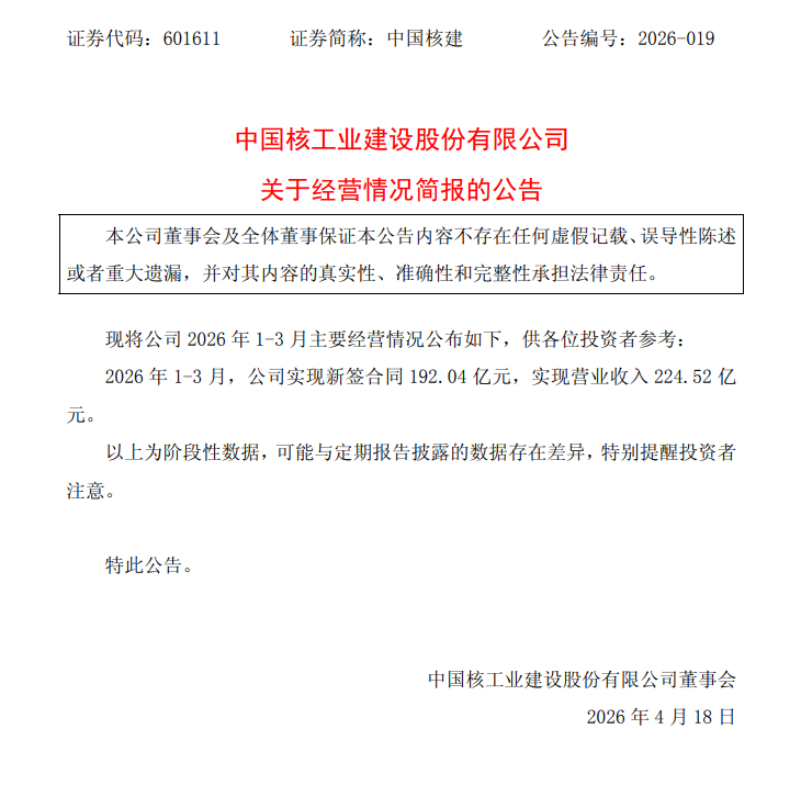 4月17日,中國(guó)核建(601611)(601611.SH)發(fā)布了關(guān)于經(jīng)營(yíng)情況簡(jiǎn)報(bào)的公告。
