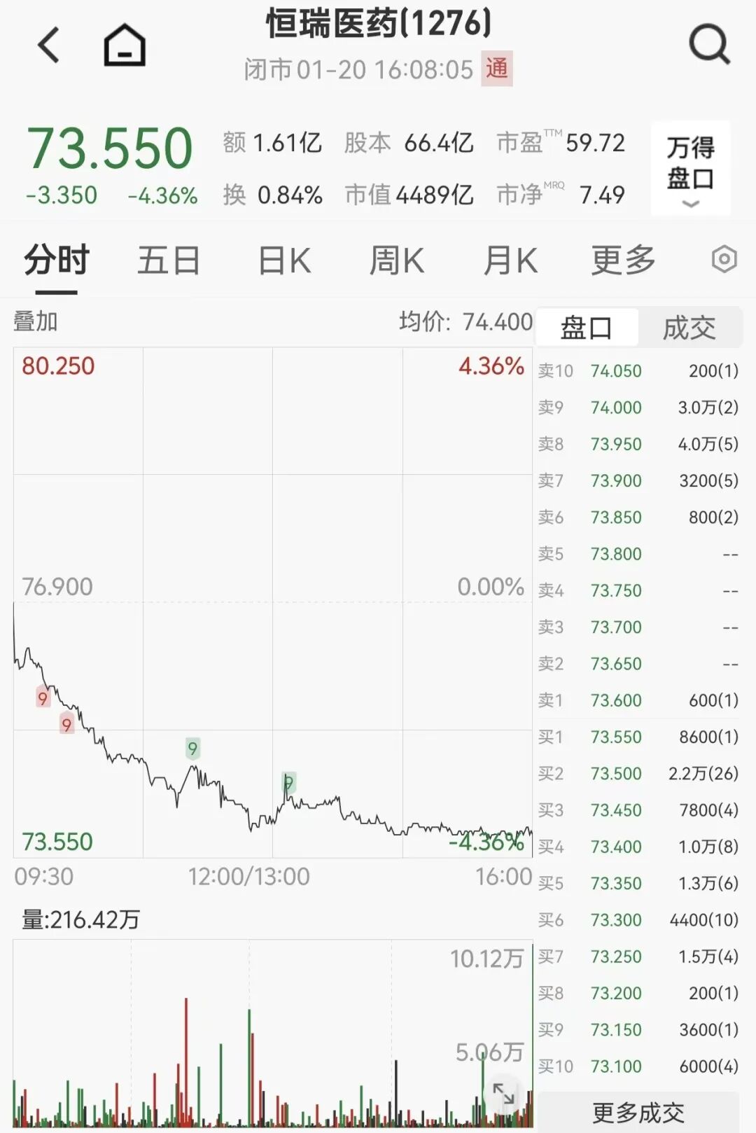 1月20日,恒瑞醫(yī)藥開盤后震蕩下行,最終收于全日最低價73.55港元/股,下跌4.36%。